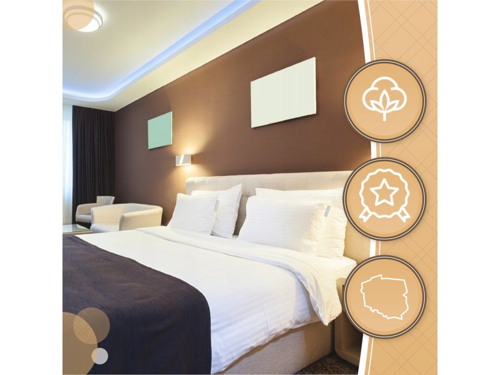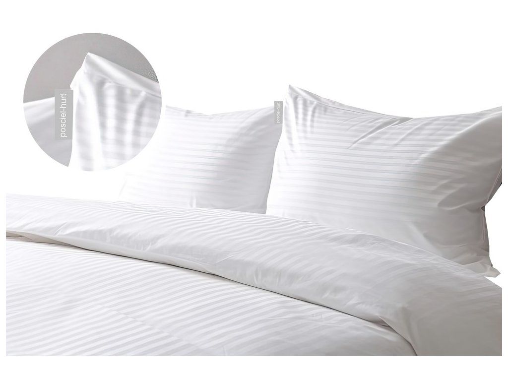 Súprava posteľnej bielizne do hotelov v bielej farbe, vyrobená zo 100% bavlny, saténová úprava, gramáž 150g/m2. Produkt odolný voči mechanickým vplyvom a mangľovaniu.