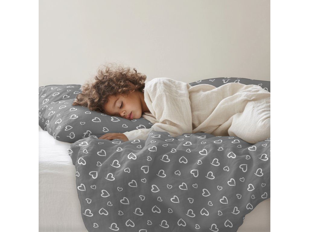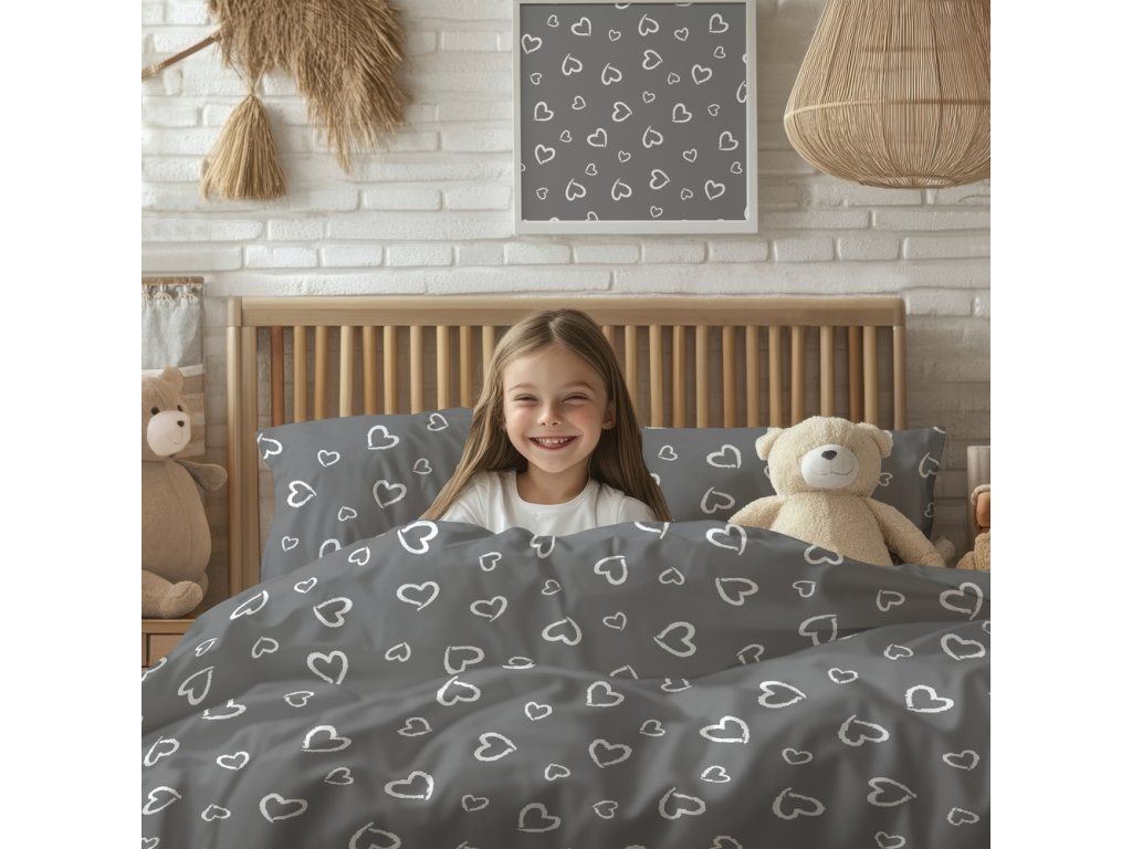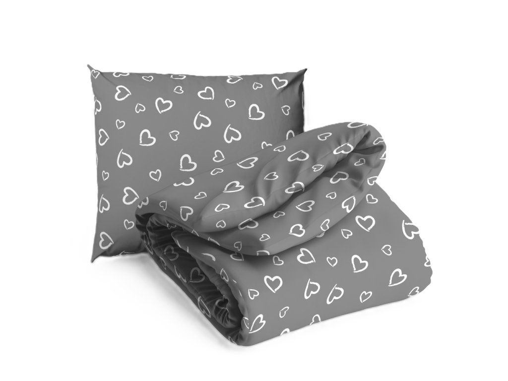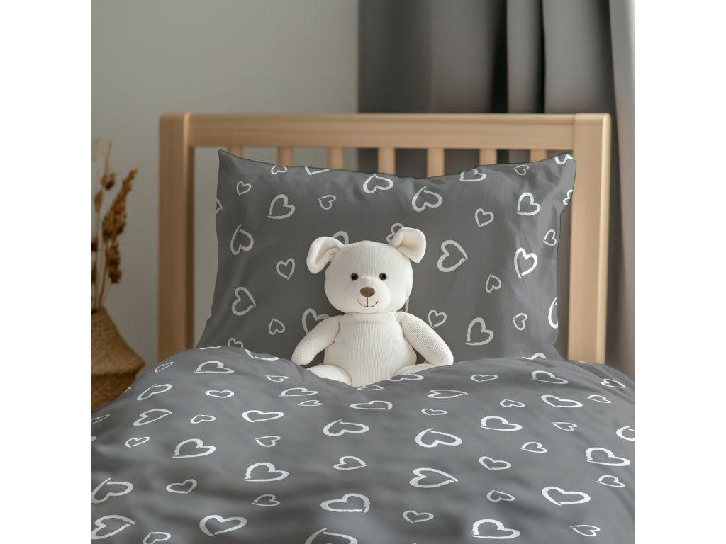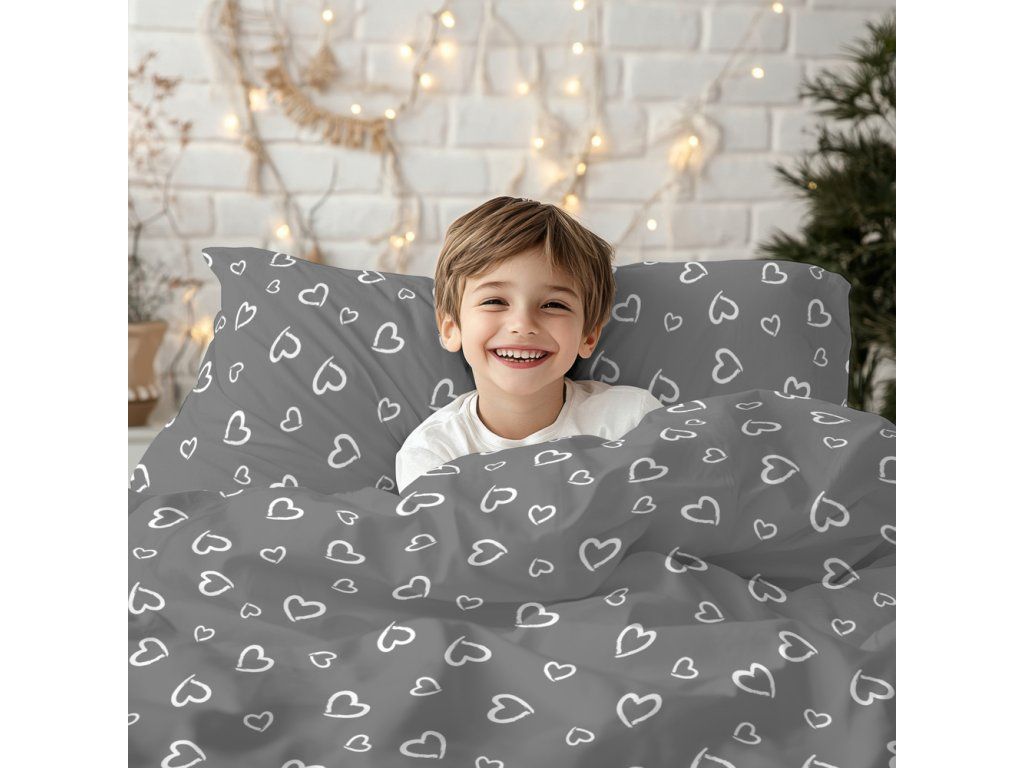 DETSKÁ posteľná bielizeň 160x200 pre dieťa 100% bavlna CERTIFIKÁT Srdcia s obrysom biele na sivom