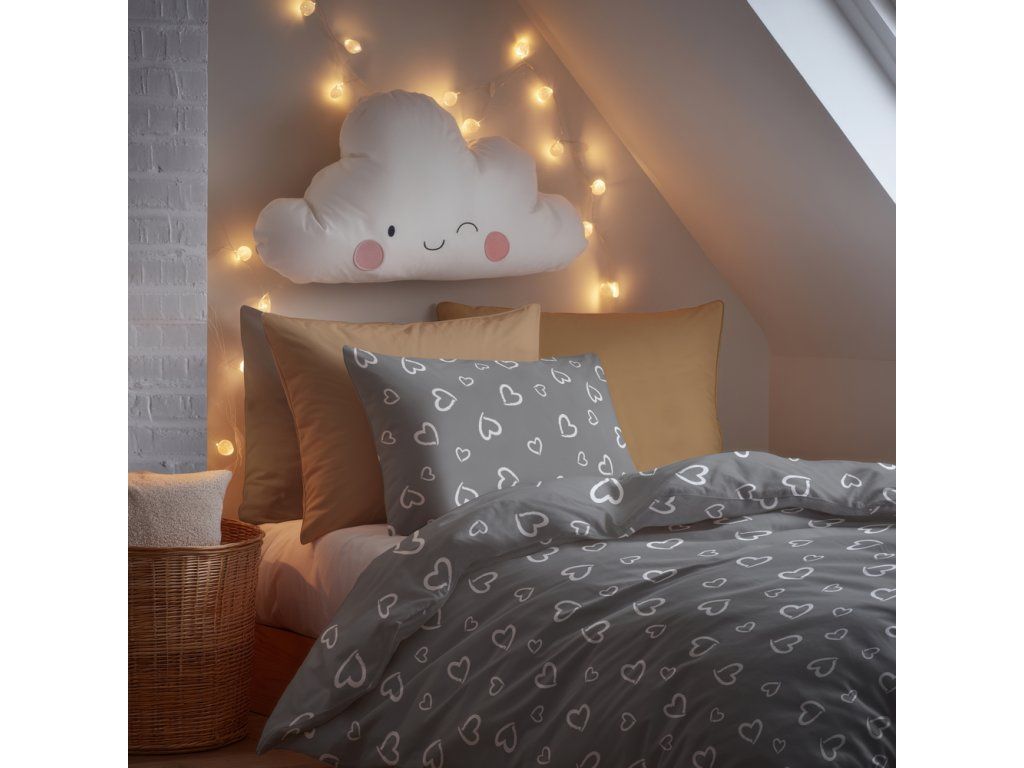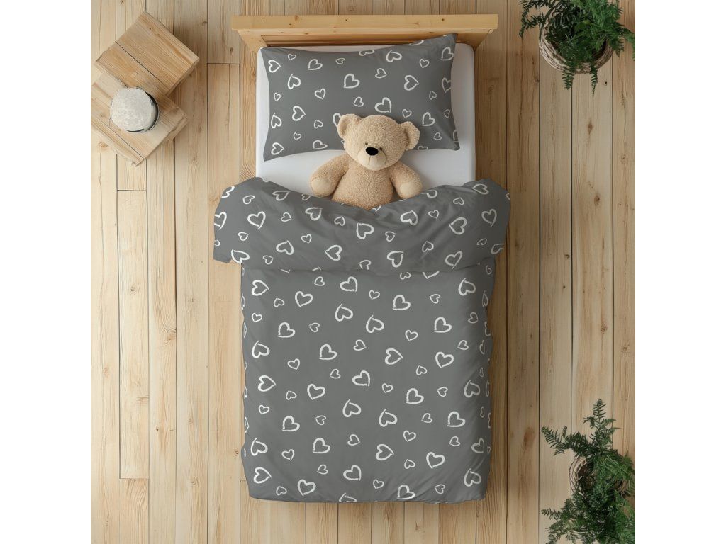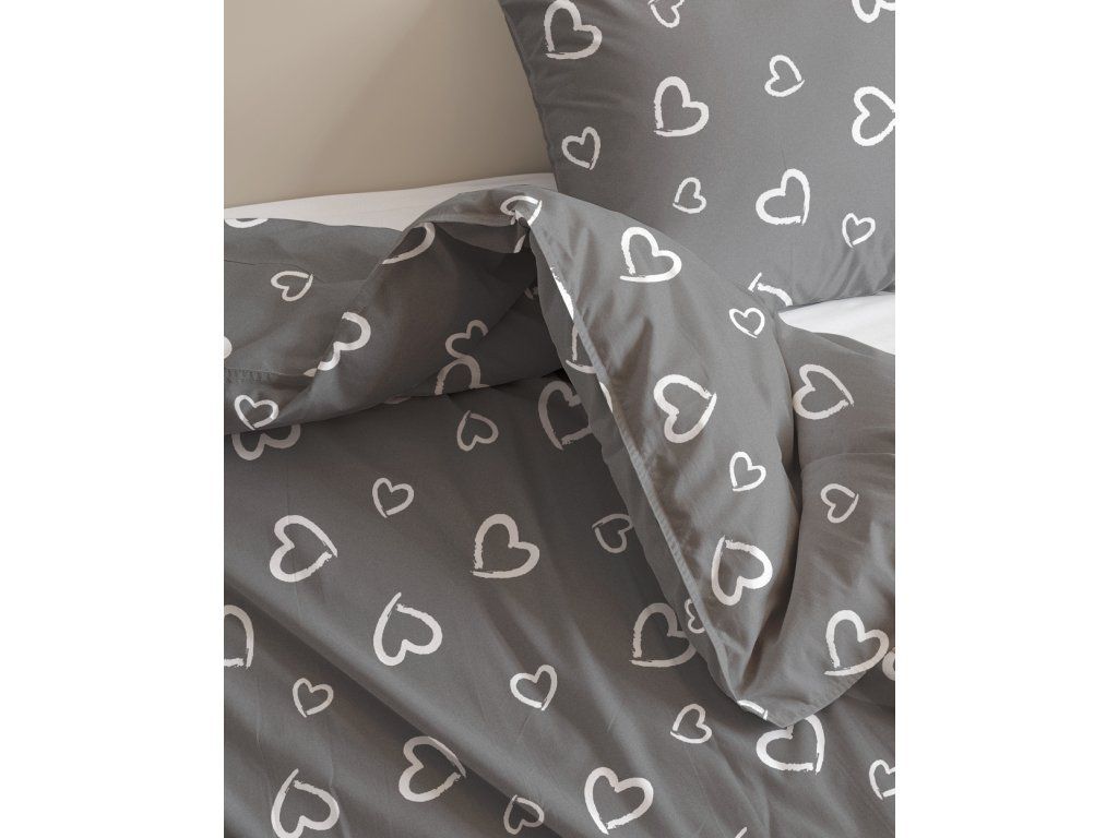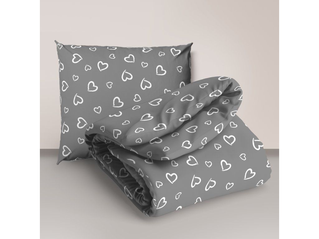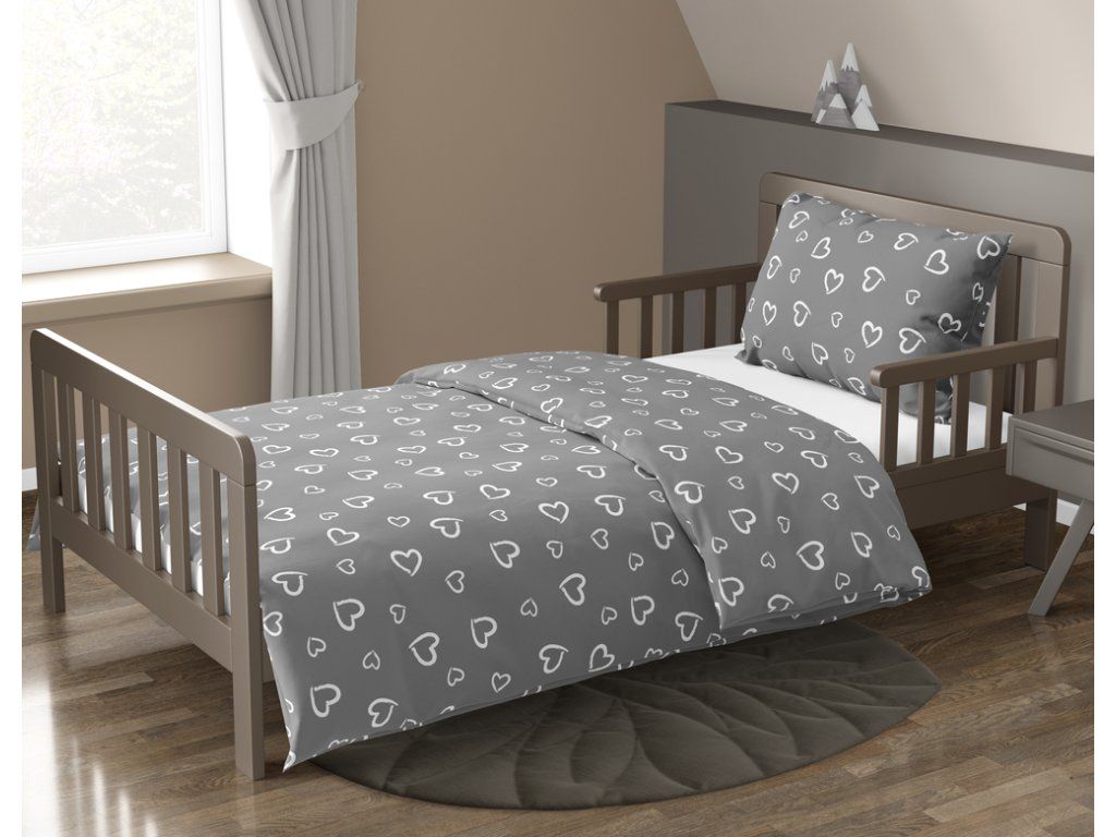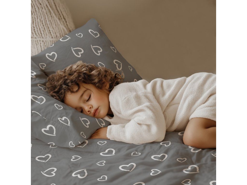 DETSKÁ posteľná bielizeň 160x200 pre dieťa 100% bavlna CERTIFIKÁT Srdcia s obrysom biele na sivom