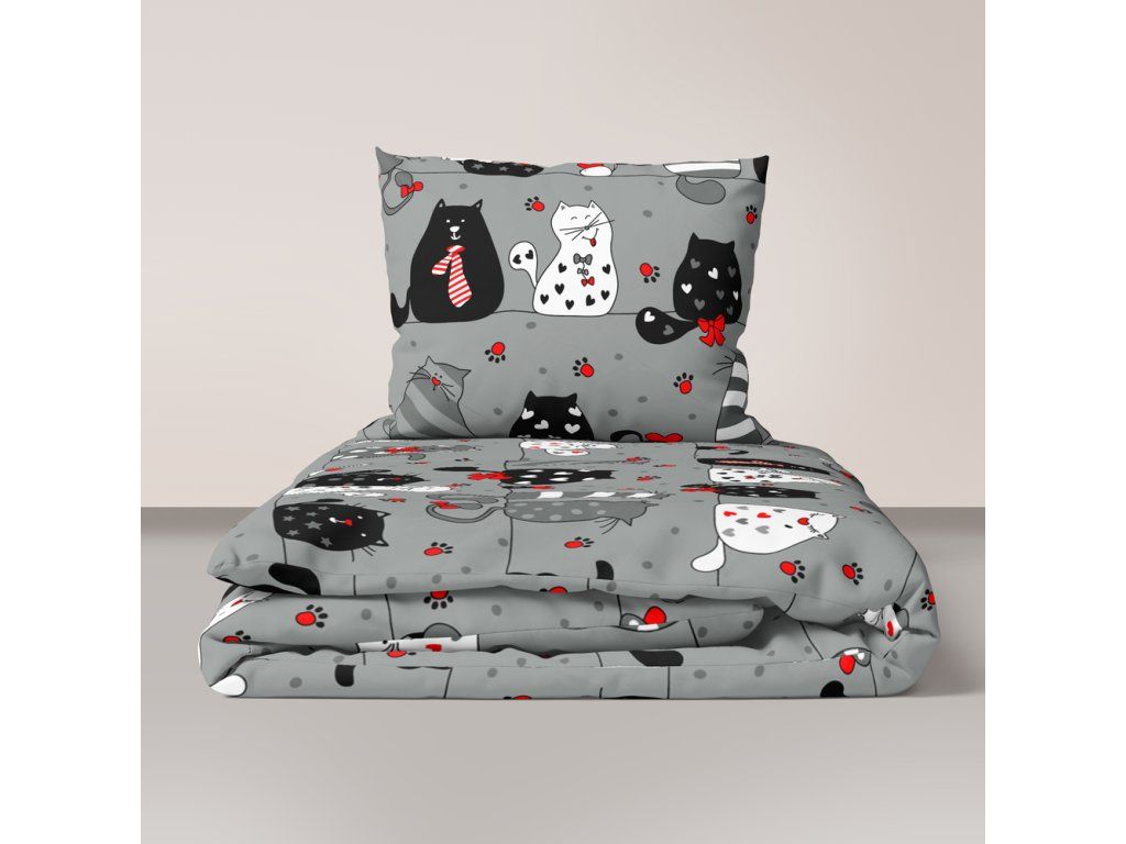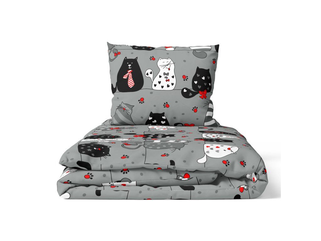 DETSKÁ POSTEĽNÁ BIELIZEŇ 90x120 + 40x60 100% BAVLNA certifikát 2-dielna do postieľky Šialené mačky čierne na sivom s červenou