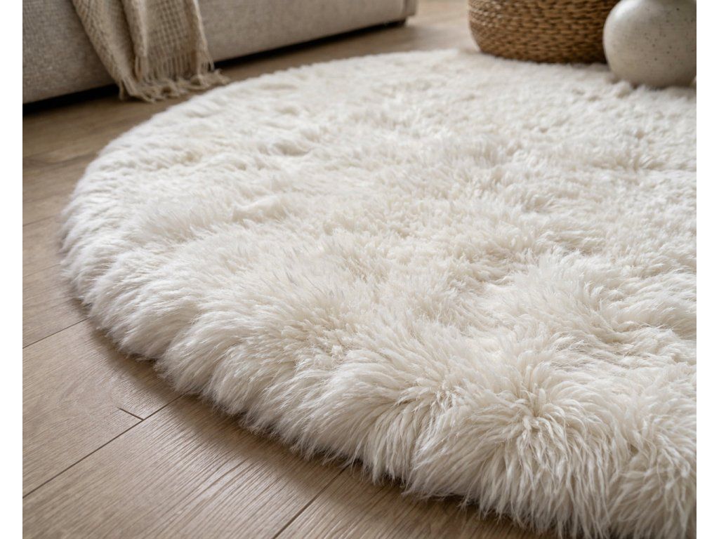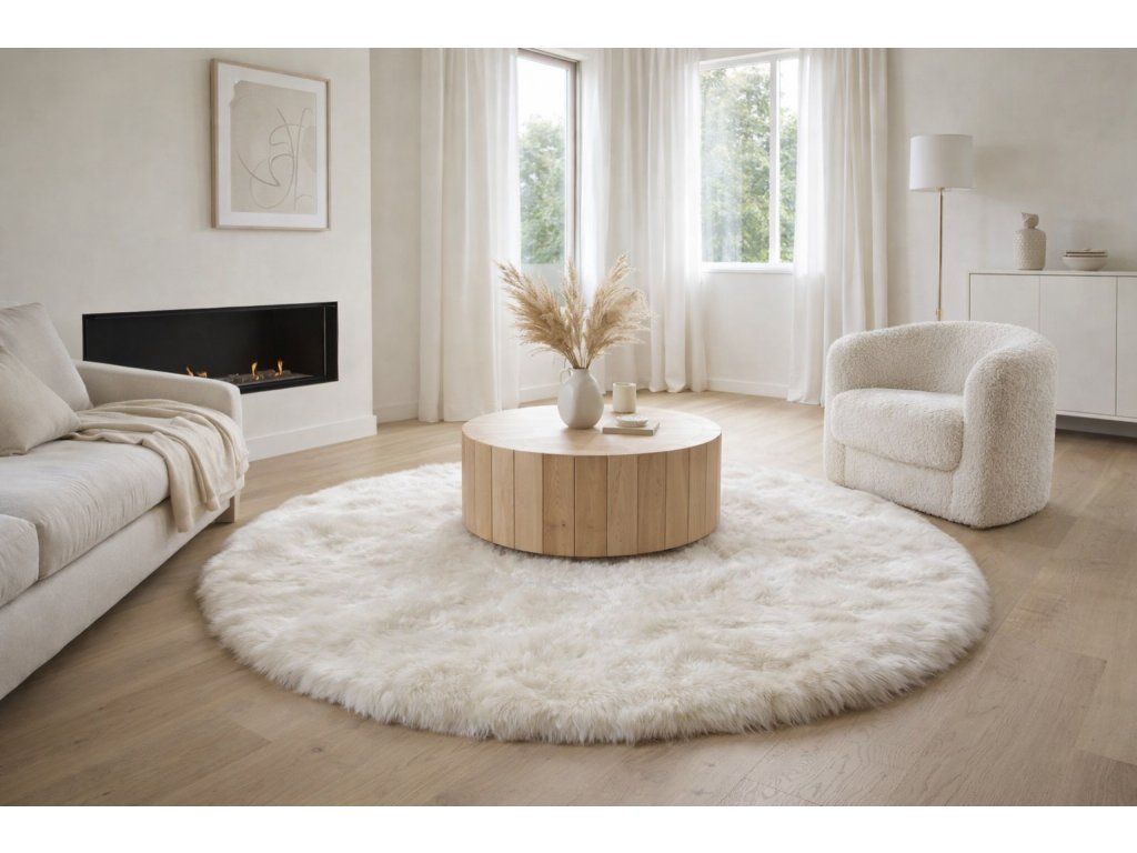 Biely koberec z ovčej kožušiny – kruhový luxus, ktorý rozžiari každý interiér
