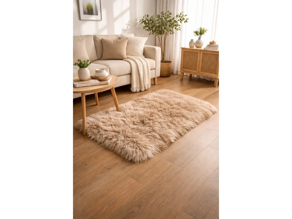 Koberec z ovčej kožušiny pôsobí ako prírodný izolant – v zime hreje, v lete príjemne chladí. V kombinácii s béžovým tónom vytvára upokojujúci hygge efekt, ktorý zútulní každý interiér – od škandinávskeho až po rustikálny.