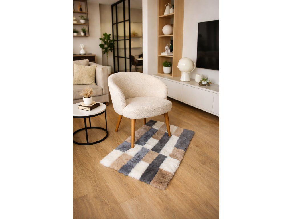 Koberec z ovčej kožušiny pôsobí ako prírodný izolant – v zime hreje, v lete príjemne chladí. V kombinácii s béžovým tónom vytvára upokojujúci hygge efekt, ktorý zútulní každý interiér – od škandinávskeho až po rustikálny.