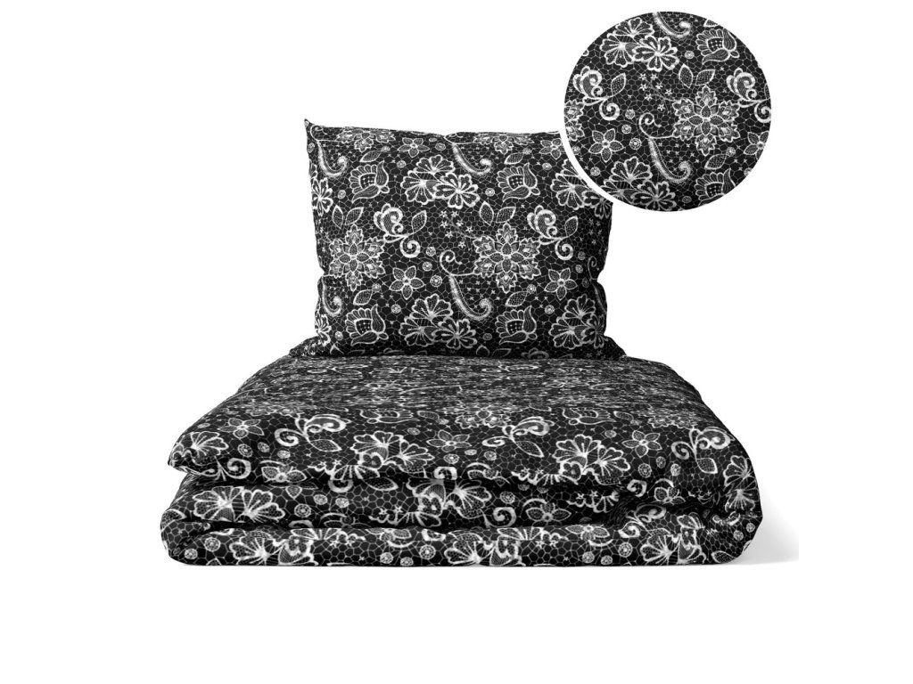 KREPOVÁ POSTEĽNÁ BIELIZEŇ 160x200 + OBLIEČKA 70x80 HRUBÁ BAVLNA - Biela čipka na čiernom pozadí