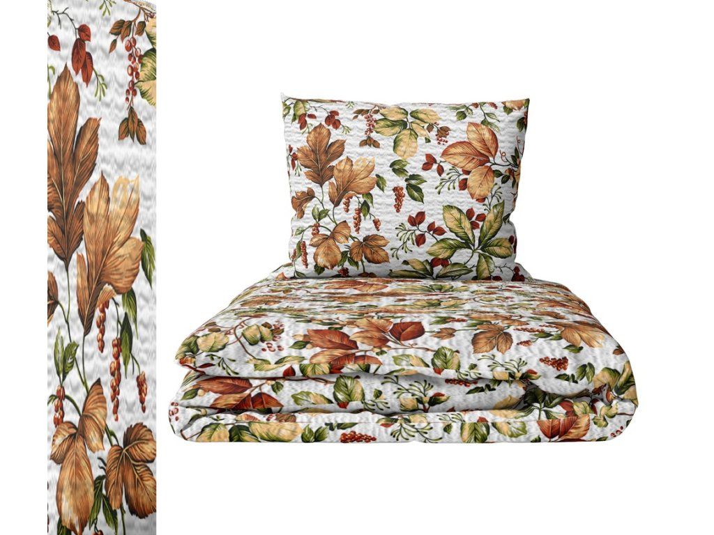 KREPOVÁ POSTEĽNÁ BIELIZEŇ 160x200 + OBLIEČKA 70x80 HRUBÁ BAVLNA - Závan jesene na bielom pozadí
