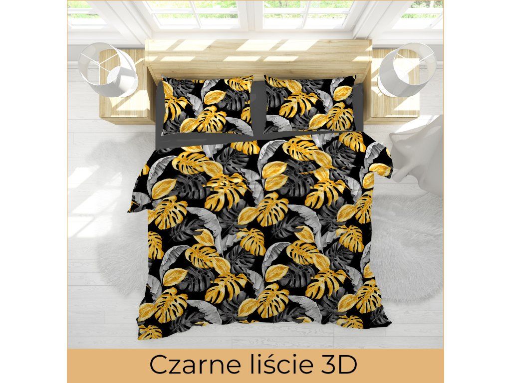 Krepové obliečky 140x200 + 1x70x80 Bavlna 100% Bielawa - PRESTIGE Čierne listy 3D
