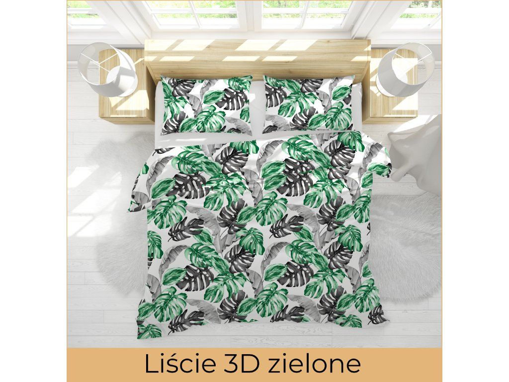 Krepové obliečky 140x200 + 1x70x80 Bavlna 100% Bielawa - PRESTIGE Zelené listy 3D