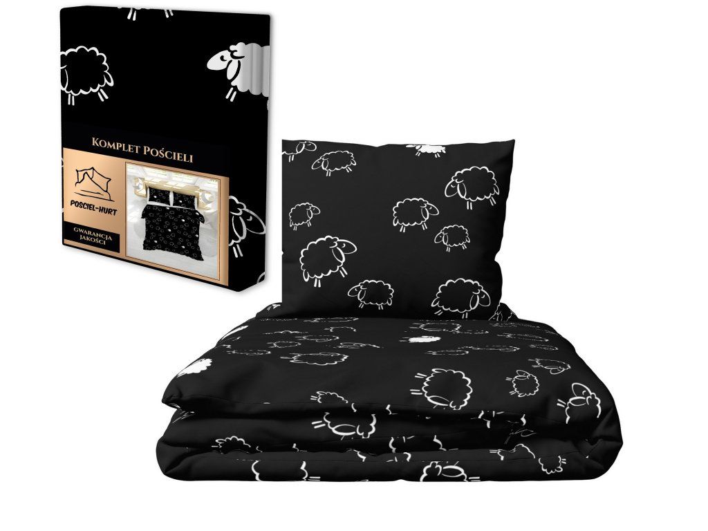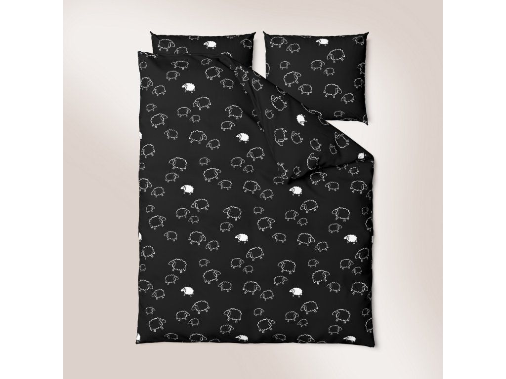 Bavlnená posteľná bielizeň 140x200cm s jednou obliečkou na vankúš 70x80cm, 100% bavlna, vzor: barančeky na čiernom pozadí.Dodatočné parametre
