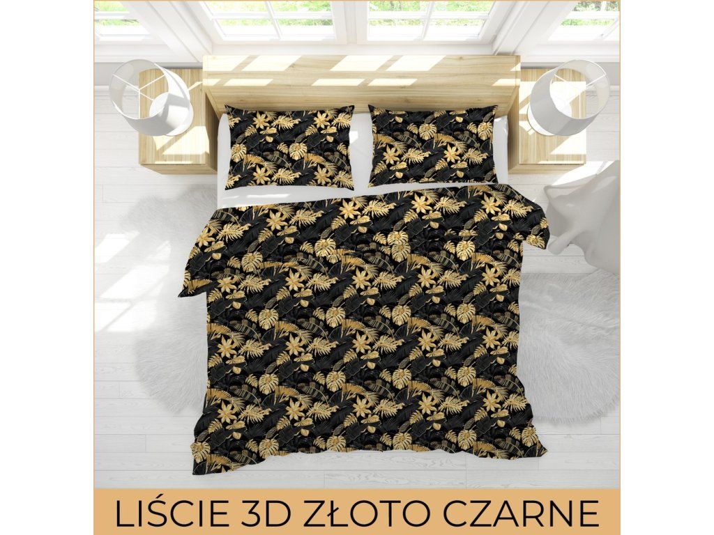 Obliečky 140x200cm, 70x80cm, 140g/m2, bavlna 100% : Listy 3D zlato čierne