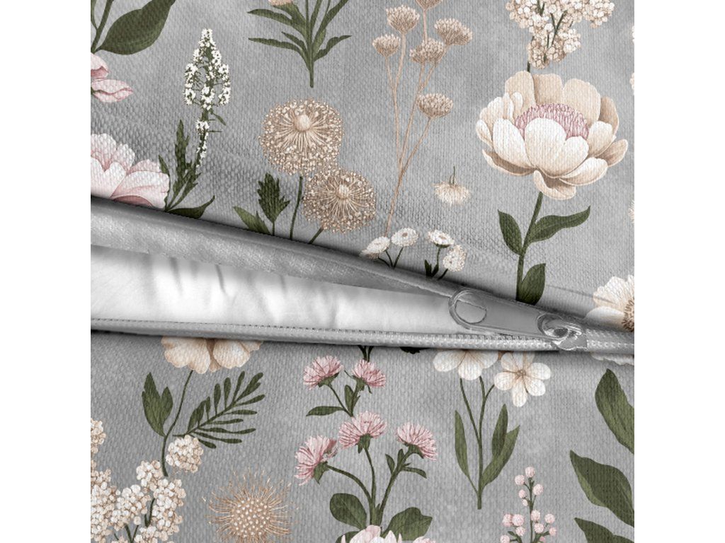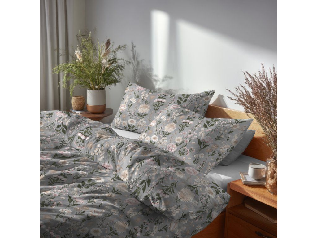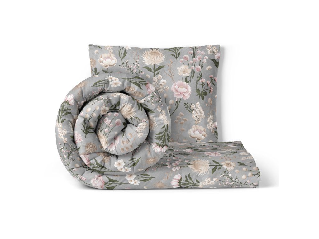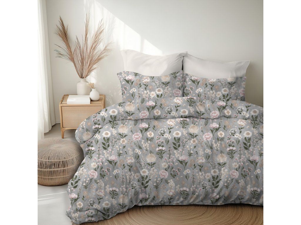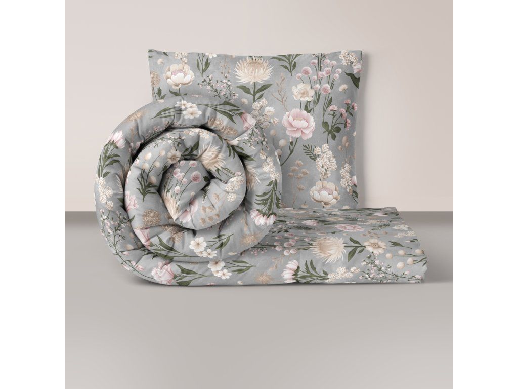 Posteľná bielizeň 140x200cm, 70x80cm, 140g/m2, 100% bavlna Kvetinová záhrada Vanilka sivo-ružová