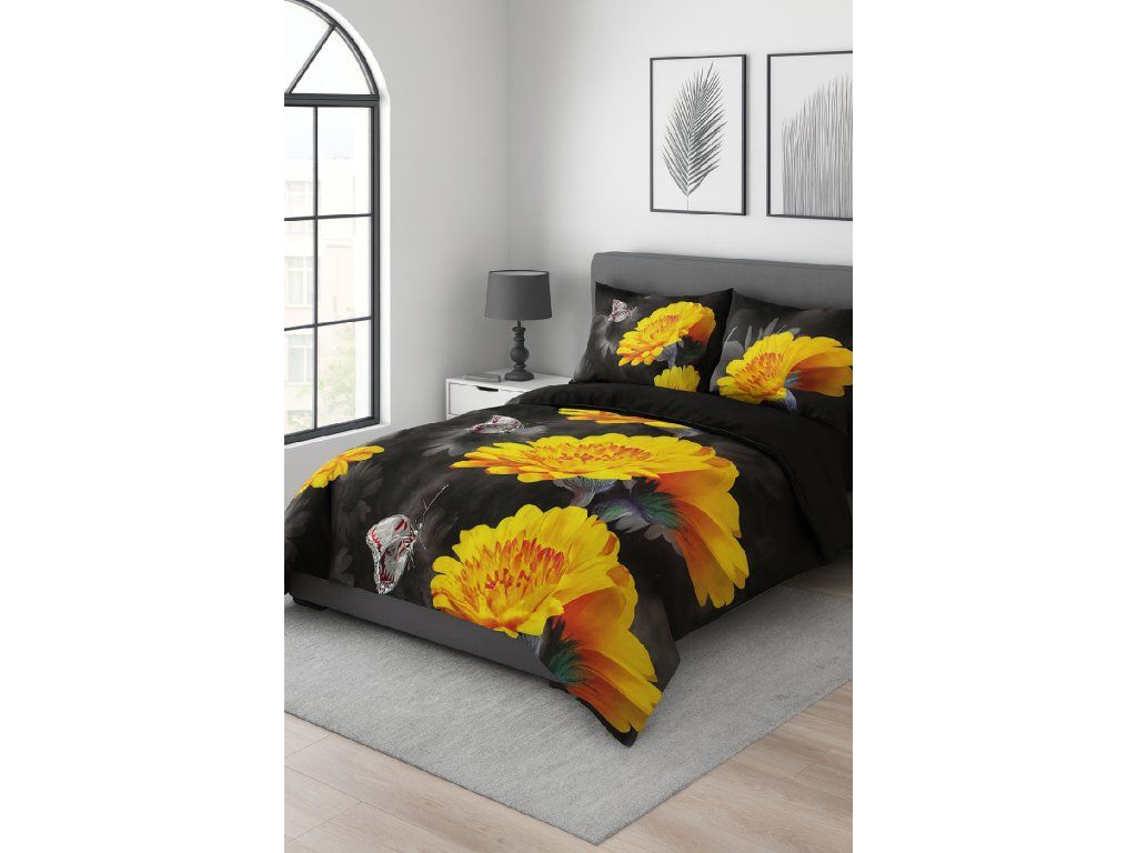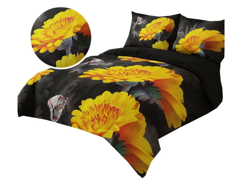 Spoznajte výnimočnú súpravu posteľnej bielizne 160x200 cm vyrobenú zo 100% mäkkého a na dotyk príjemného mikrovlákna. Je to ideálna voľba pre ľudí, ktorí si cenia komfort spánku, jednoduchú údržbu a moderný, výrazný dizajn. Posteľná bielizeň vyniká fotorealistickým motívom žltých kvetov a jemných motýľov – potlač je mimoriadne detailná, intenzívna a trvácna, vďaka čomu súprava skvele vyzerá v každej modernej spálni.