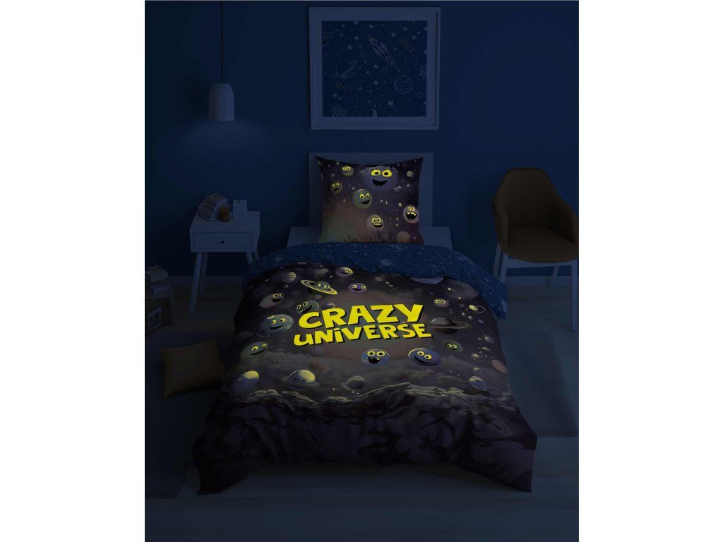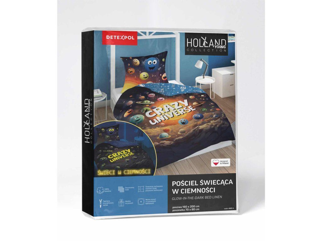 Obliečky svietiace v tme značky Holland Young Collection boli vytvorené s ohľadom na mladších zákazníkov. Mládežnícke motívy, intenzívne farby a efekt svietenia v tme zatraktívnia vzhľad izby dieťaťa alebo tínedžera.