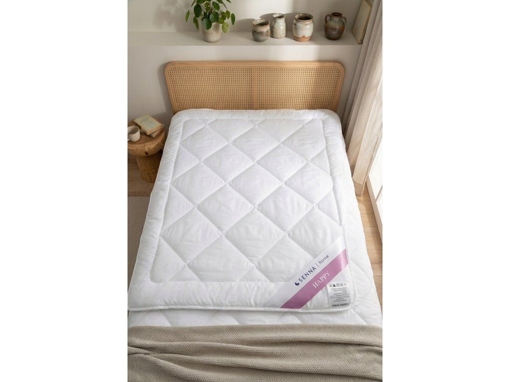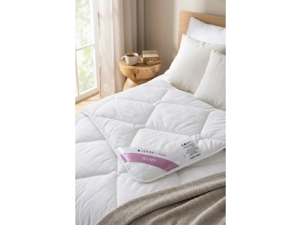 Prikrývka vo veľkosti 155x200cm značky HAPPY. Vysokokvalitný produkt s antialergickými vlastnosťami. Vďaka ideálne zvolenej hmotnosti výplne (1100g) sa prikrývka skvele hodí do vašej spálne počas celého roka a zaručí vám zdravý a komfortný spánok.
