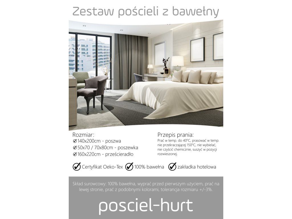 SÚPRAVA: HOTELOVÁ POSTEĽNÁ BIELIZEŇ 140x200cm + PLACHTA 160x220cm – 140g/m2, 100% BAVLNA.