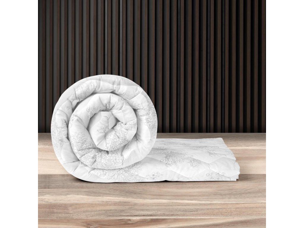 Prikrývka je vyplnená kvalitným antialergickým silikónovým vláknom, ktoré zabezpečuje nadýchanosť, pružnosť a dlhú životnosť. Je ľahká, priedušná a zároveň zaručuje udržiavanie optimálnej telesnej teploty počas spánku. Vďaka tomu zabraňuje prehriatiu a nadmernému poteniu. Jemný kvetinový vzor v odtieňoch sivej jej dodáva eleganciu a hodí sa do mnohých interiérových aranžmánov.