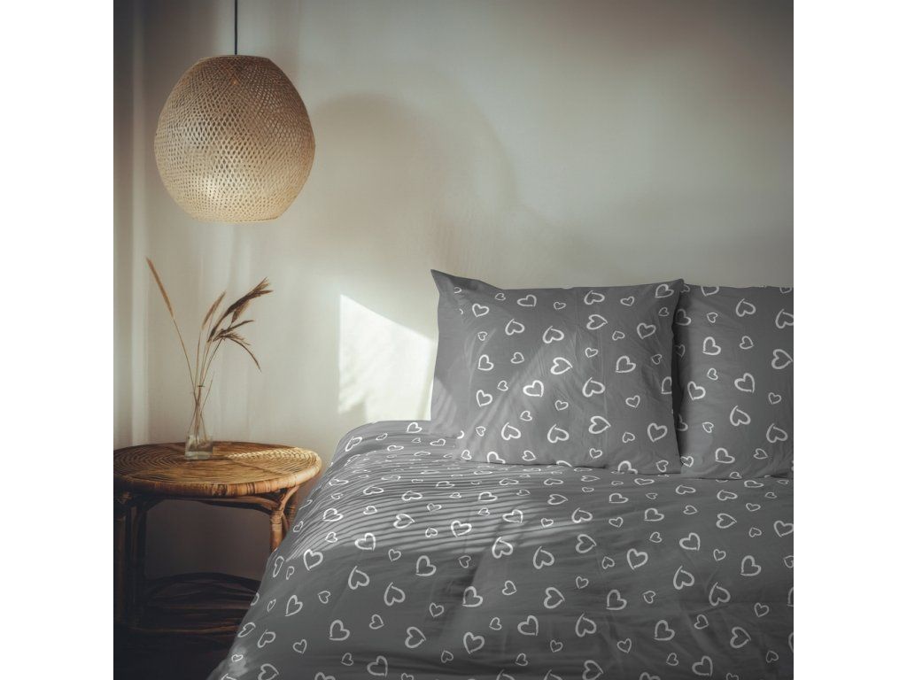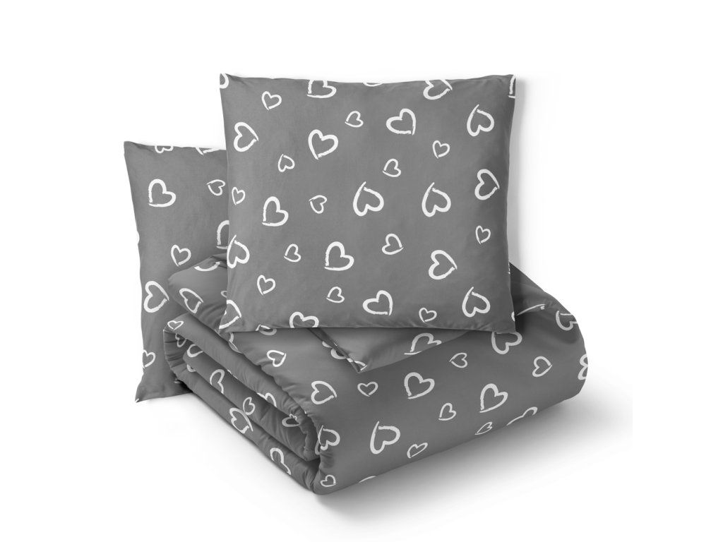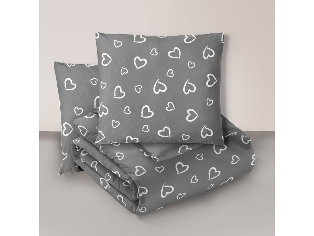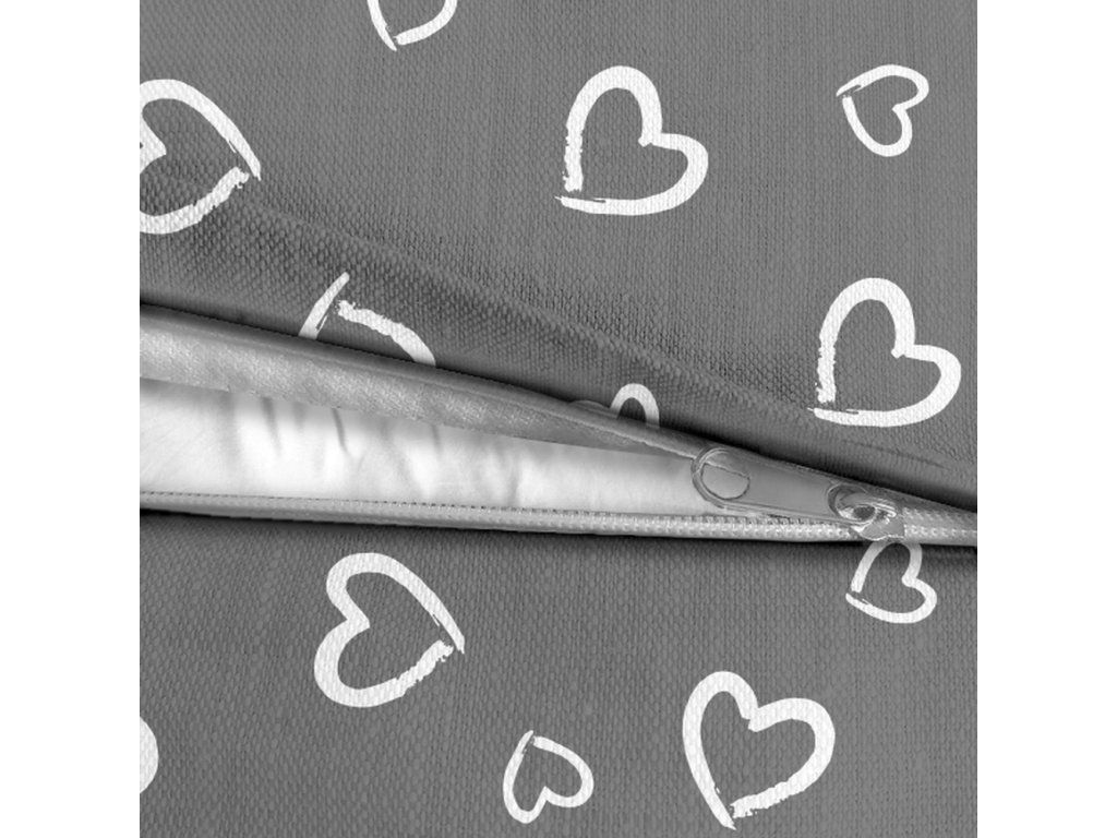 Súprava posteľnej bielizne 160x200 + 2x70x80, 100% bavlna, 140g/m2, vzor: Biele srdcia s obrysom na sivom
