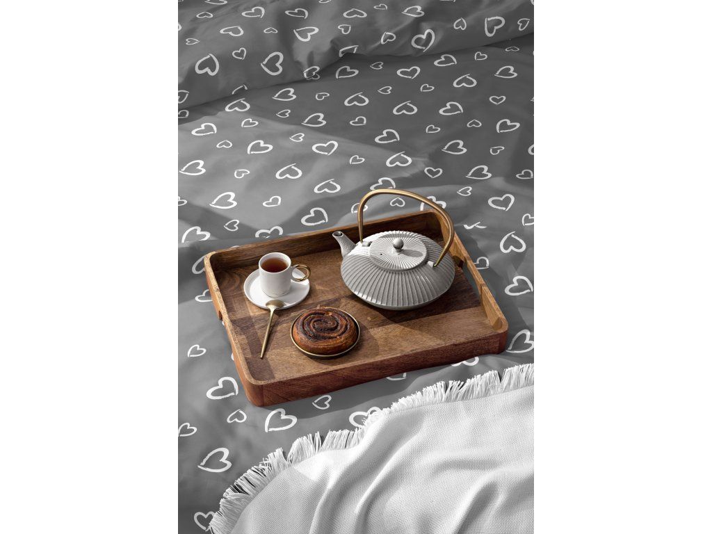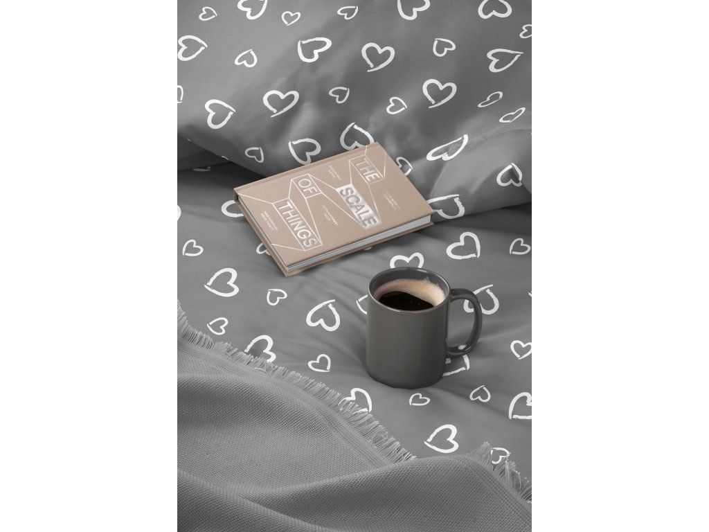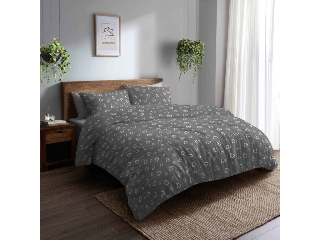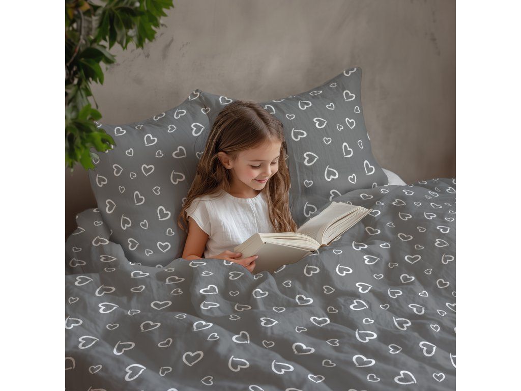 Súprava posteľnej bielizne 160x200 + 2x70x80, 100% bavlna, 140g/m2, vzor: Biele srdcia s obrysom na sivom