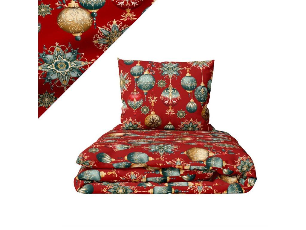 Vianočná súprava posteľnej bielizne 140x200 cm, zimná, 100% bavlna, vzor: červeno-zelené ozdoby na červenom pozadí