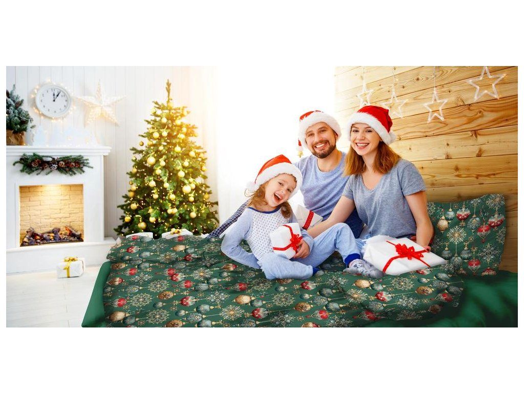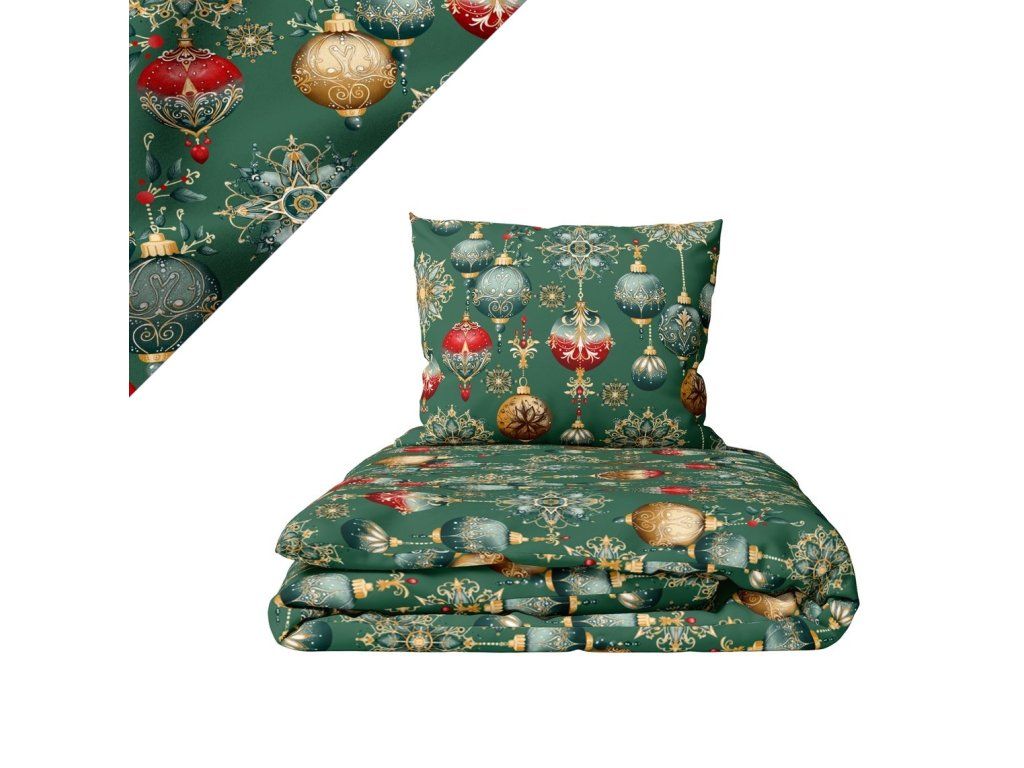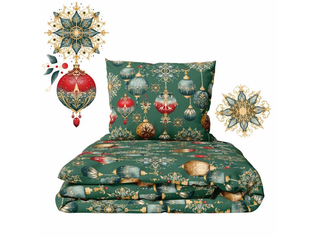 Vianočná súprava posteľnej bielizne 140x200 cm, zimná, 100% bavlna, vzor: červeno-zelené ozdoby na zelenom pozadí