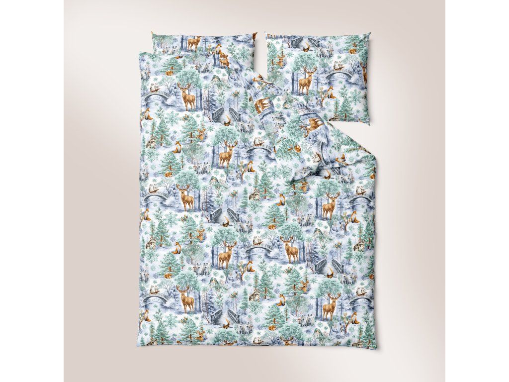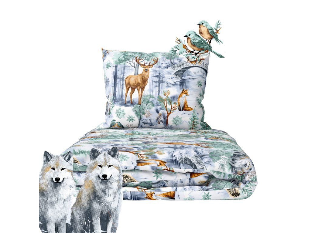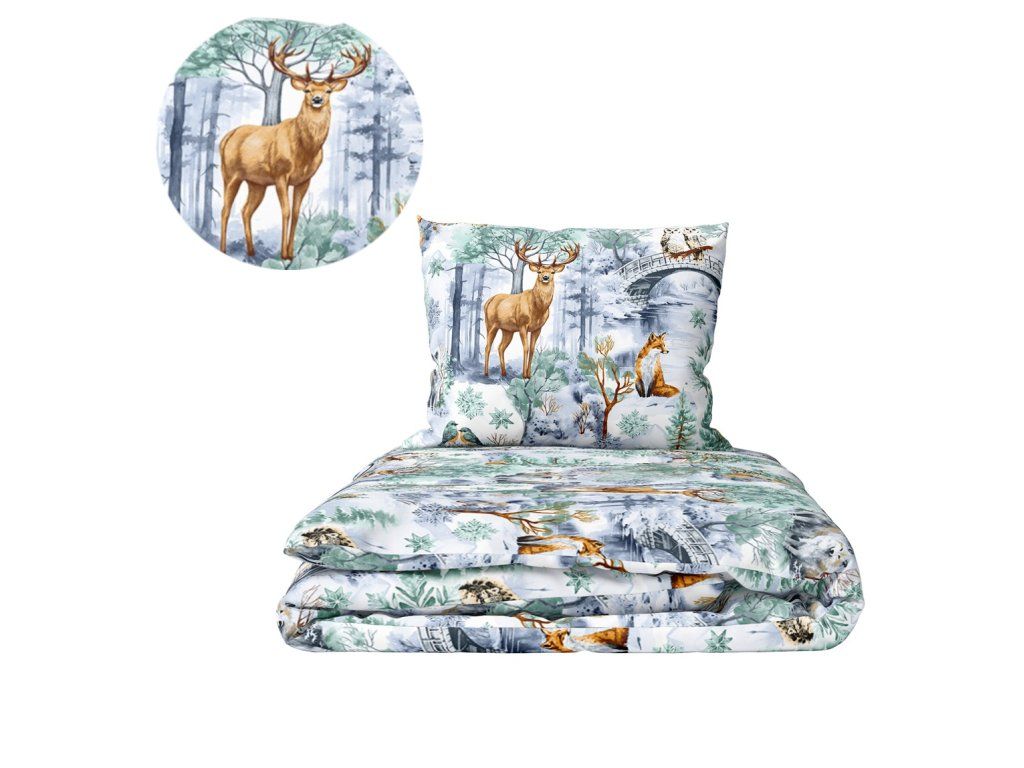 Obliečky s lesnými zvieratami na pozadí zeleného zimného lesa