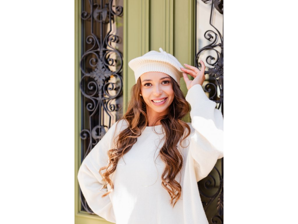 Biela vlnená baretka z 100 % merino vlny poskytuje príjemné teplo a nadčasový štýl, vďaka čomu je perfektným doplnkom pre všetky elegantné ženy v chladnom období.