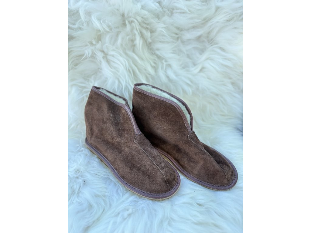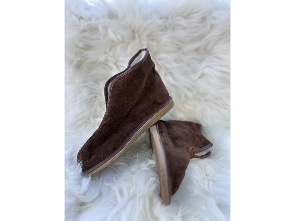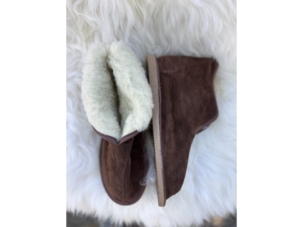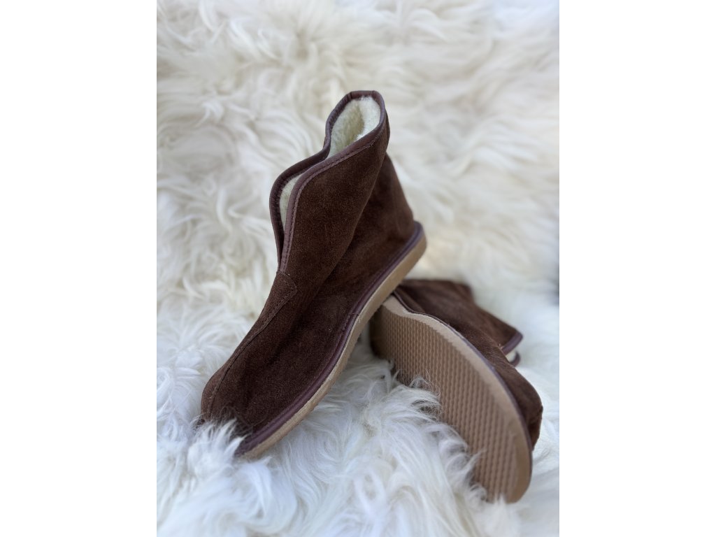Vsuvky sú vyrobené z poctivej ovčej vlny, ktorá je známa svojimi výnimočnými termoregulačnými vlastnosťami – v zime hreje, v lete odvádza vlhkosť a udržiava nohy v príjemnom suchu. Hnedý semišový povrch pôsobí elegantne, jemne a je príjemný na dotyk. Vnútro tvorí hustá vlnená výplň, ktorá sa prispôsobí tvaru nohy a ponúka mäkký a komfortný pocit pri každom kroku.
