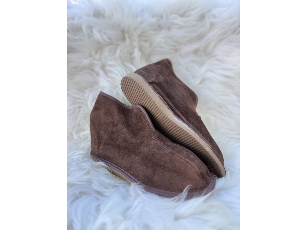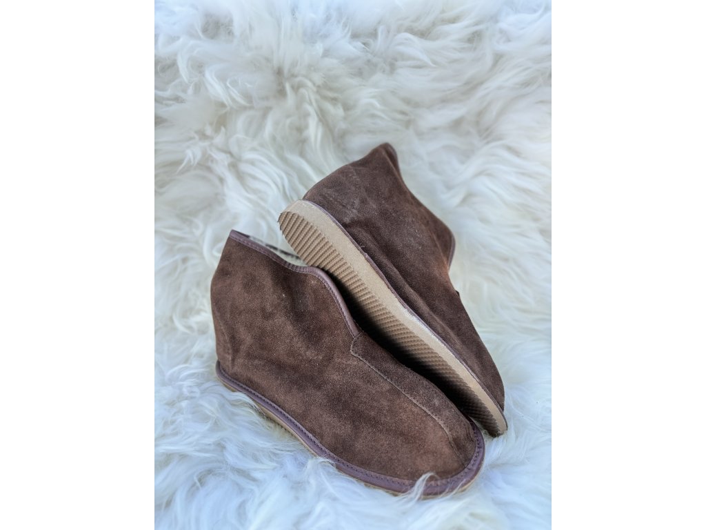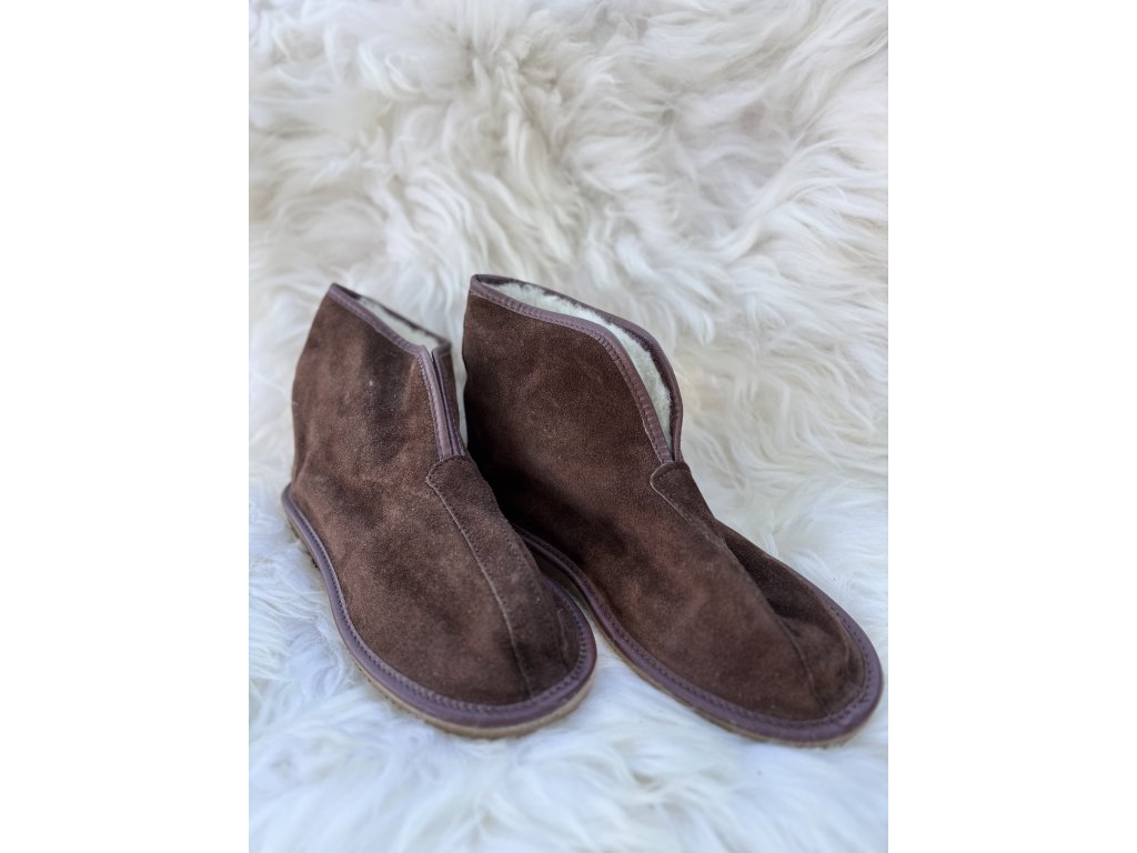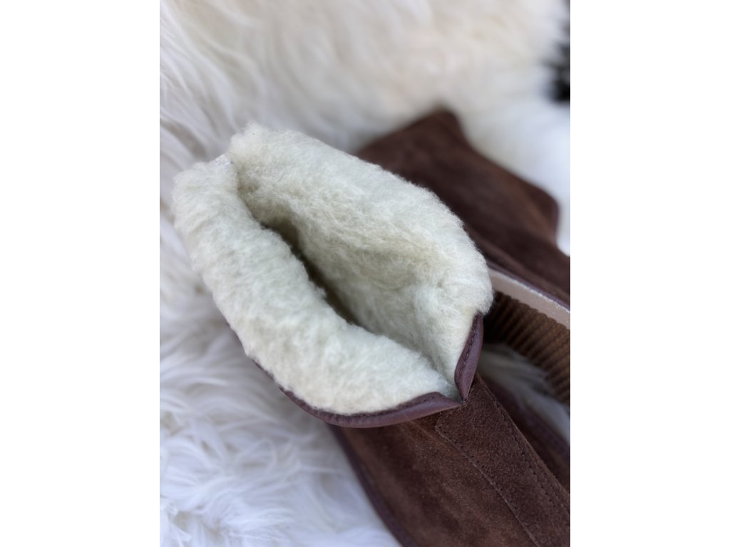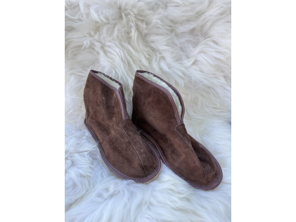 Vsuvky sú vyrobené z poctivej ovčej vlny, ktorá je známa svojimi výnimočnými termoregulačnými vlastnosťami – v zime hreje, v lete odvádza vlhkosť a udržiava nohy v príjemnom suchu. Hnedý semišový povrch pôsobí elegantne, jemne a je príjemný na dotyk. Vnútro tvorí hustá vlnená výplň, ktorá sa prispôsobí tvaru nohy a ponúka mäkký a komfortný pocit pri každom kroku.